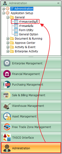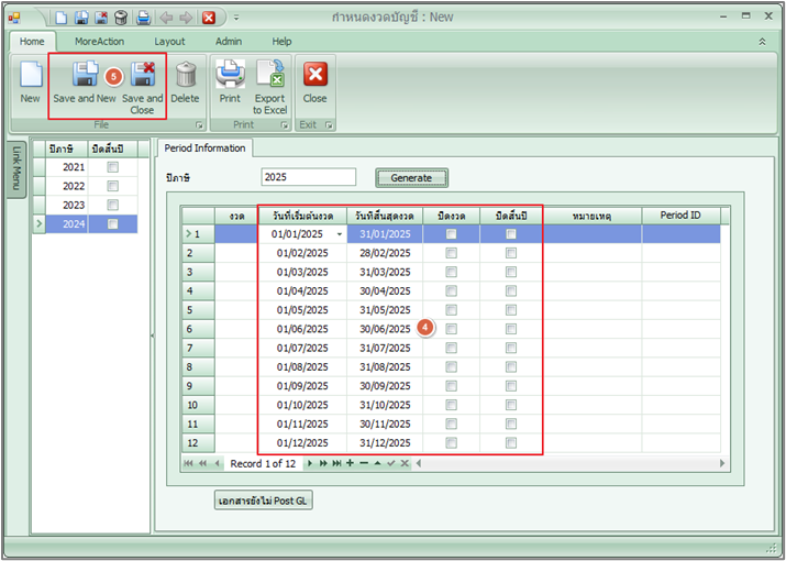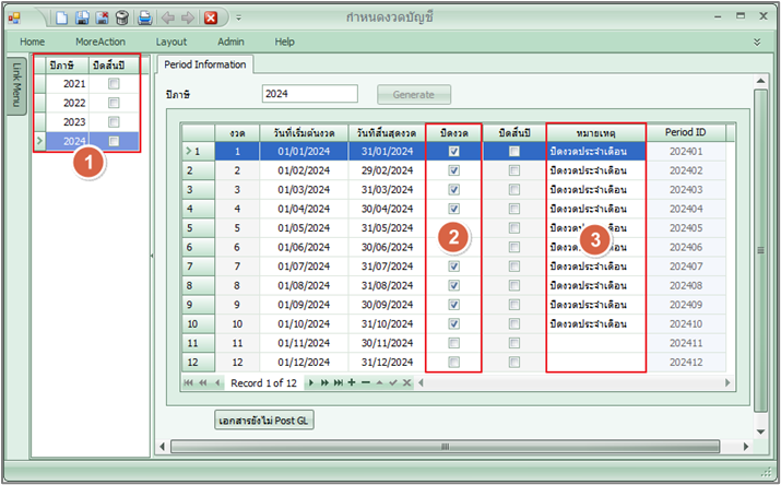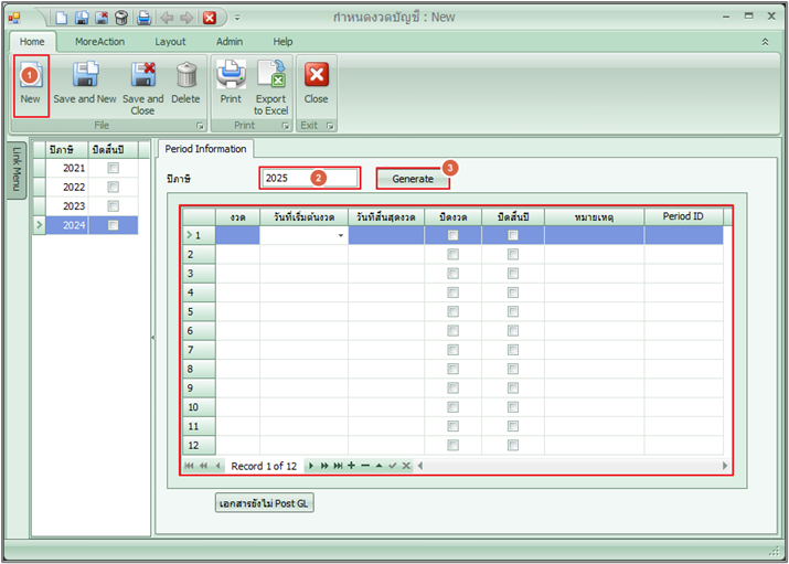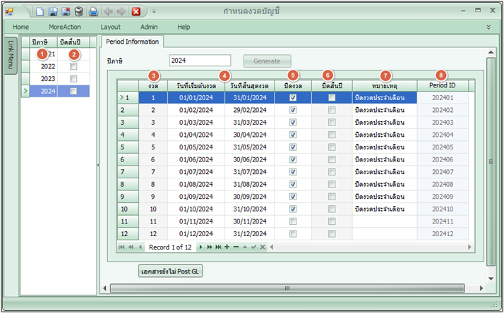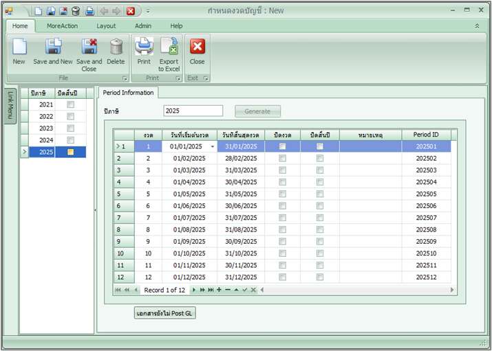<< Click to Display Table of Contents >> Navigation: TASCO ERP > Administration > Application Setup > General > กำหนดงวดบัญชี |