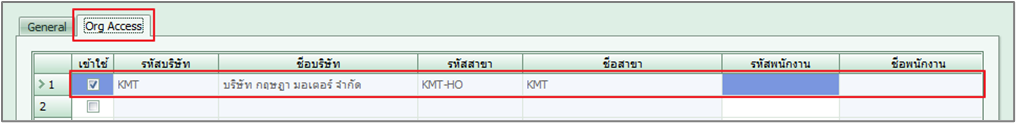 Tab Org Access คือการกำหนดว่าต้องการให้ผู้ใช้งานสามารถเข้าใช้งานบริษัทใดได้บ้าง ให้ติ๊กเครื่องหมายถูกในคอลัมน์ เข้าใช้ หน้าบริษัทที่ต้องการจากนั้นให้เลือกรหัสพนักงานตามที่บันทึกไว้ในระบบ เมื่อเสร็จแล้วให้กดปุ่มบันทึกเป็นอันเรียบร้อย