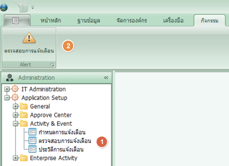 ขั้นตอนการทำงานของการแจ้งเตือน {Dev}: เมื่อผู้ใช้ Login เข้าโปรแกรม หรือใช้ผ่านเมนู “ตรวจสอบการแจ้งเตือน” ในแท็บ “กิจกรรม” บนทูลบาร์ของโปรแกรม