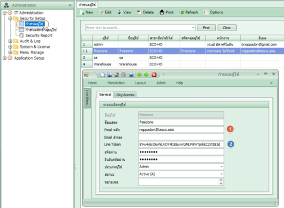 หน้าจอกำหนดผู้ใช้ •อีเมลหลัก: สำหรับแจ้งเตือนเข้าอีเมล •Line Token: สำหรับการแจ้งเตือนผ่าน Line (ไม่สามารถใช้ไลน์ส่วนตัวในการกำหนดได้)