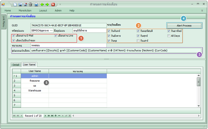 กำหนดการแจ้งเตือน (Info) 1.รูปแบบการแจ้งเตือน และการแจ้งเตือนไปยังเจ้าของ สำหรับการแจ้งเตือนการอนุมัติ 2.วันที่กำหนดให้แจ้งเตือน 3.รูปแบบข้อความส่วนรายละเอียด (ผู้ใช้ไม่สามารถแก้ไขได้) 4.สำหรับการทดสอบการแจ้งเตือน 5.การแจ้งเตือนไปยังผู้ใช้ตามที่กำหนด |