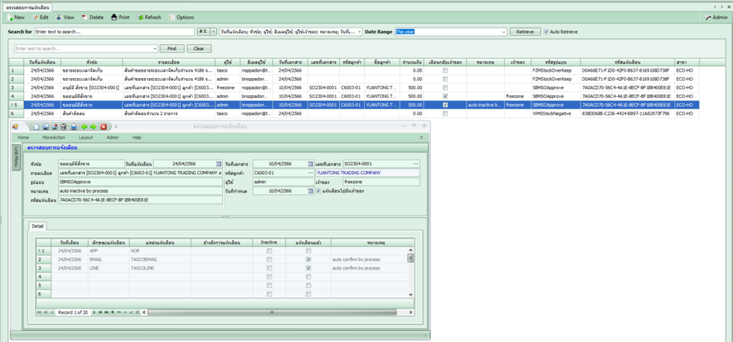 แหล่งการแจ้งเตือน: TASCOEMAIL (แจ้งเตือนเข้าอีเมล), TASCOLINE (แจ้งเตือนเข้าไลน์) และกรณีเป็นอื่นๆ คือชื่อเครื่องที่ผู้ใช้เข้าใช้ กรณีต่างเครื่องกัน จะแสดงซ้ำขึ้นมา