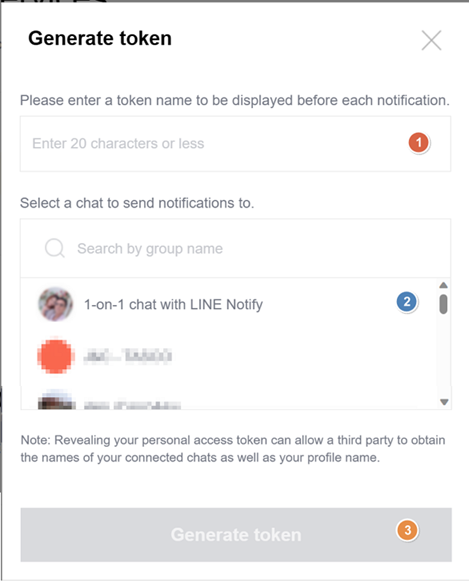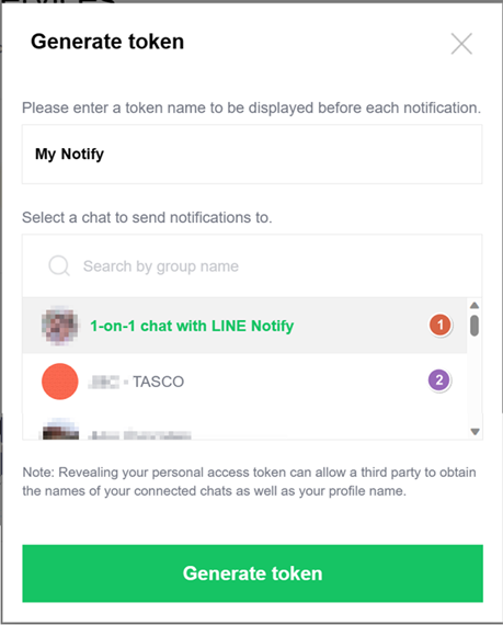 3.ระบุ Token Name และเลือก Group ที่จะแจ้งเตือน โดยแยกเป็น 2 ส่วน ➢เลือก ‘1-on-1 chat with LINE notify’ สำหรับกรณีแจ้งเตือนเข้าไลน์ตนเอง ➢เลือก ‘Group chat’ สำหรับการแจ้งเตือนเข้ากลุ่มที่ตั้งไว้ โดยกรณีที่แจ้งเตือนเข้า Group chat นั้น ต้องเพิ่ม ‘LINE notify’ เข้าไว้ในกลุ่มด้วย