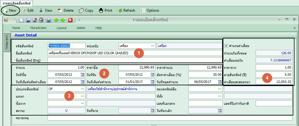 การกำหนดรายละเอียดสินทรัพย์ คลิก New เพื่อเพิ่มรายการ แล้วระบุรายละเอียดแต่ละคอลัมภ์ ดังนี้