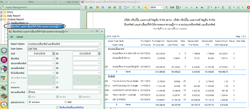 ให้เข้าที่ analysis report เลือกราคายงานตามประเภทสินทรัพย์ และสินรัพย์ และเลือก Range จะได้รายงานเพิ่อนำไปบันทึกบัญชี ส่วนของ range รายงานสามารถเลือกการดูรายงานได้ว่าต้องการแสดงแบบสรุปหรือแบบแจกแจง