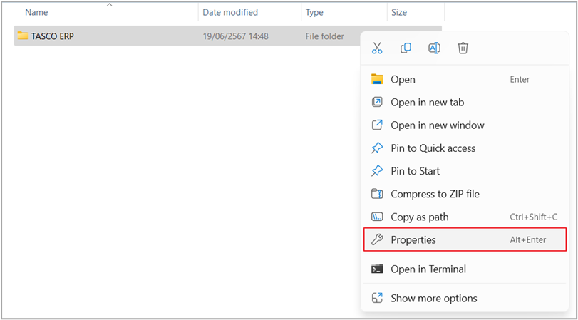 2. คลิกขวาที่ Folder TASCO ERP แล้วไปที่ Properties