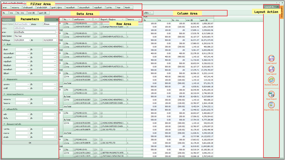 ส่วนของการจัดการรายงานเพิ่มเติม เช่น การ save รูปแบบรายงานที่สร้างขึ้น การ Load รายงานที่สร้างขึ้นมาใช้ หรือการ Export เป็น Excel files รายละเอียดดังนี้ |