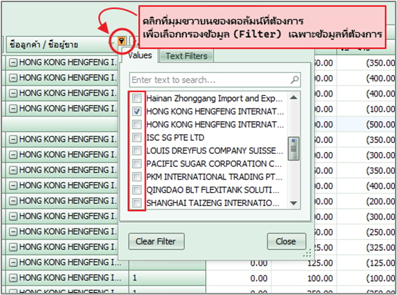 หมายเหตุ การกรองข้อมูลที่ต้องการ หากไม่ได้เลือกจาก Parameters สามารถกรองข้อมูล (Filter) จากแต่ละคอลัมน์ได้และสามารถสลับการเลือกข้อมูลได้จากลูกศรสลับข้อมูลที่เลือก