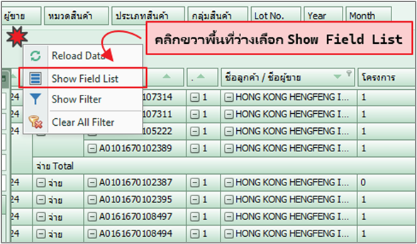 Filter Area: ส่วนของ column ต่าง ๆ ใน Module นั้น ๆ การแสดง Column หากต้องการใช้ Column เพิ่มเติมสามารถคลิกขวาพื้นที่ว่างแล้วเลือก “Show Field List” โปรแกรมจะแสดง Field ที่ซ่อนไว้ แล้วลากมาใช้งานโดยว่างตำแหน่งที่ต้องการได้เลย