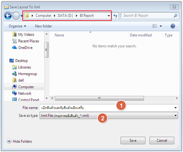 Save รูปแบบ BI Report ที่สร้างไว้ สามารถ Save เก็บเพื่อใช้เฉพาะเครื่อง หรือ Save ไว้ที่ Serve เพื่อนำมาใช้ร่วมกันหลายเครื่อง การ Save Layout ทำได้โดย คลิก Save Layout และตั้งชื่อ Files ที่ต้องการ โดยไม่ต้องใส่ชื่อเมนู เนื่องจากโปรแกรม Default ไว้แล้ว |
