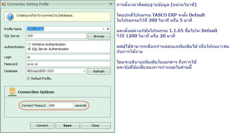 ลักษณะการติดต่อฐานข้อมูลมี 2 ลักษณะ (โปรแกรม TASCO ERP ใช้ฐานข้อมูล Microsoft SQL Server เวอร์ชั่น 2008R2 เป็นต้นไป)