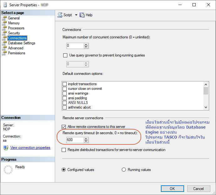 •ฐานข้อมูล Microsoft SQL Server จะมี Properties ของตัวเองชื่อ “Remote query timeout” ซึ่งเงื่อนไขส่วนนี้จะไม่มีผลต่อโปรแกรมที่ติดต่อฐานข้อมูลโดย Database Engine อย่างเช่นโปรแกรม TASCO ERP ก็จะไม่สนใจในเงื่อนไขส่วนนี้