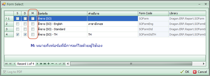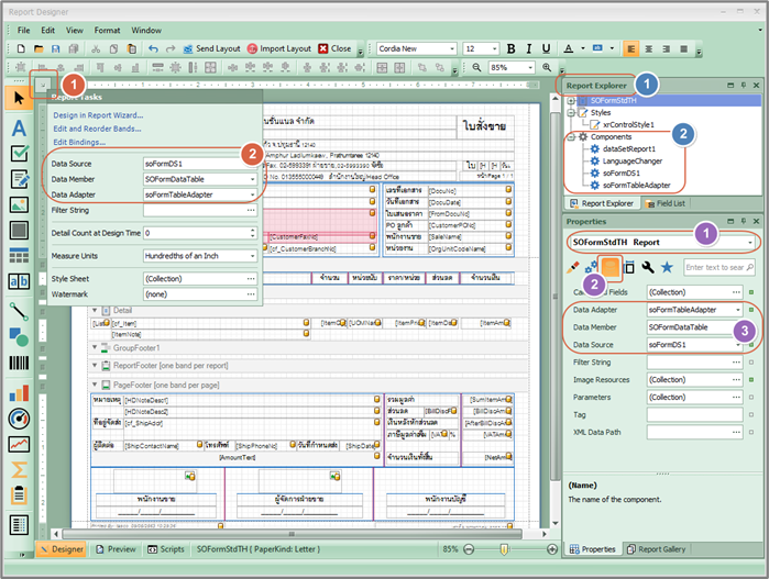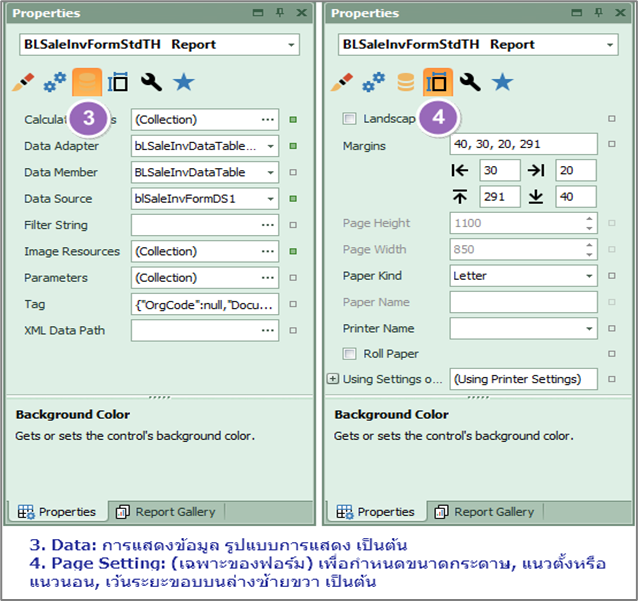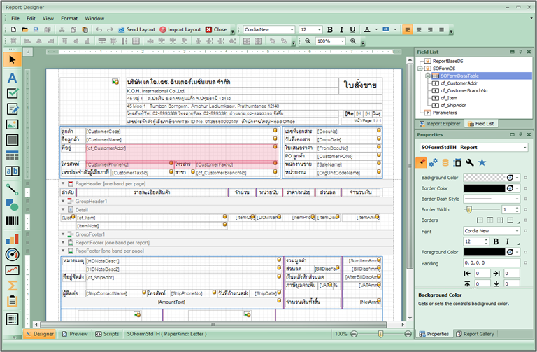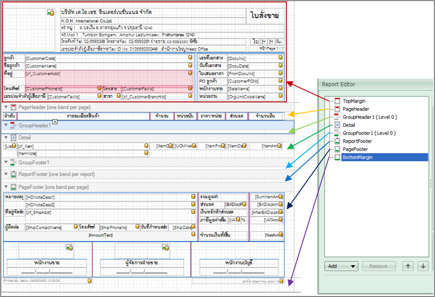การแสดงข้อมูลเพิ่มเติม: เนื่องจากการจัดการของฟอร์ม ในการแสดงข้อมูลเฉพาะหน้าสุดท้ายของเอกสาร ยังมีข้อจำกัด ทางทีมงานพัฒนา จึงมีคอลัมน์ IsLastRow ไว้ เพื่อนำไปใช้เป็นเงื่อนไขในการแสดงว่าเป็นรายการสุดท้ายของเอกสาร แล้วนำคอลัมน์นี้ไปเป็นเงื่อนไขของการแสดง ยอดเงิน หรือ Footer เฉพาะหน้าสุดท้ายของเอกสารเท่านั้นได้