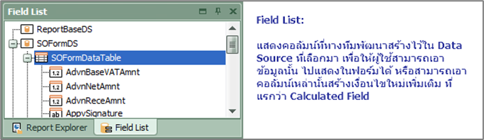 จาก Report Explorer ซึ่งแสดงในส่วนของ Components ซึ่งในส่วนนี้จะมีส่วนของ Field List ที่จะอธิบาย ต่อเนื่องไป |