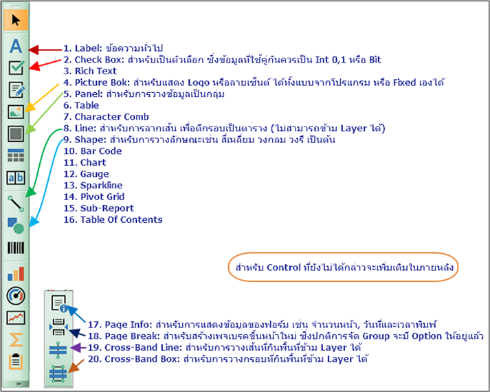 รู้จักกับ Control เบื้องต้นที่มีใช้ในฟอร์ม: เป็นส่วนของการใช้แสดงข้อมูลในฟอร์ม เช่นข้อความ โลโก้ กรอบ เส้น เป็นต้น
