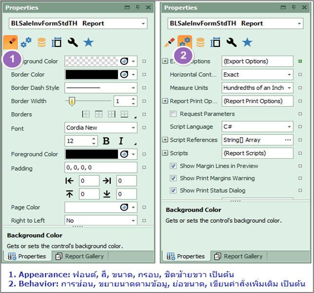 การเลือกใช้ฟอนต์: ฟอนต์จะมีตัวอย่างตามด้านล่าง การเลือกฟอร์นจะมีผลมาก โดยในส่วน Detail หากความสูงระหว่างบรรทัดมาก จะแสดงรายการได้น้อยลง ซึ่งเป็นผลมาจากการตั้ง Properties “Can Grow” ของการแสดงข้อมูล เช่นการแสดงชื่อสินค้า หรือรายละเอียดสินค้า หรือที่อยู่ลูกค้า เป็นต้น