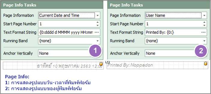 ➢ Page Info: สำหรับการแสดงข้อมูลของฟอร์ม เช่น จำนวนหน้า, วันที่และเวลาพิมพ์