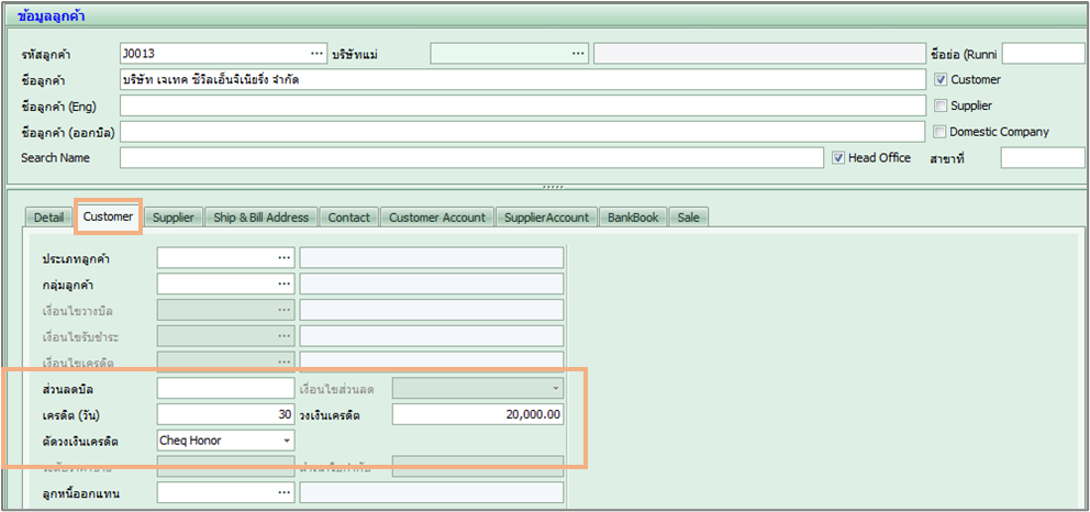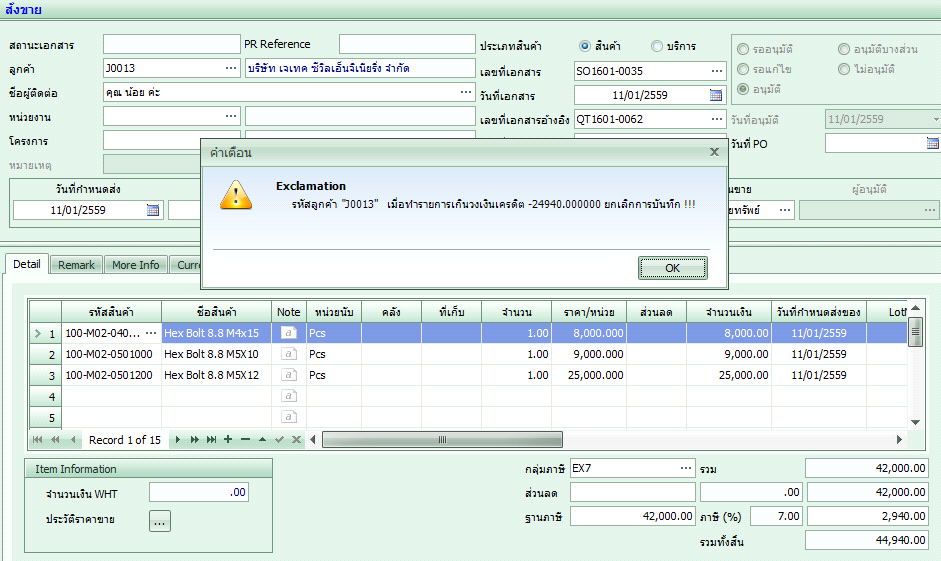 3.โปรแกรมจะเตือนเมื่อมีการ Save ข้อมูล หากมีการตั้งวงเงินเครดิตไว้