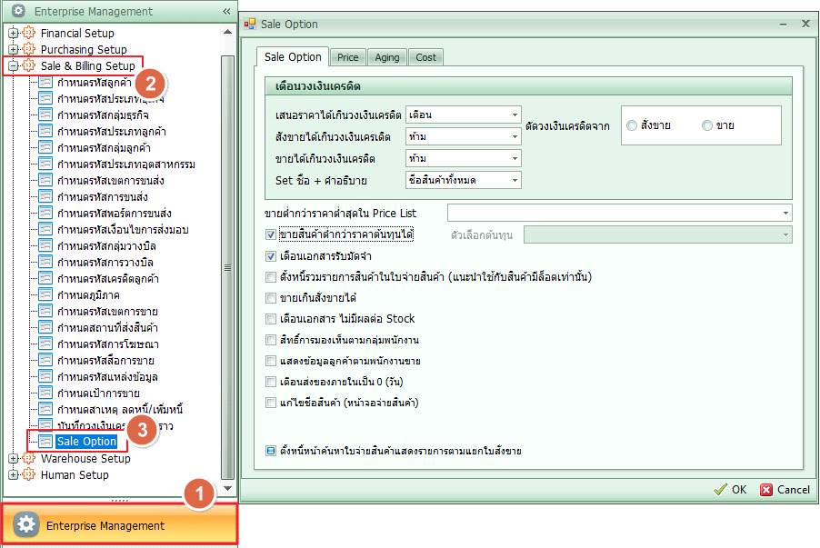 โปรแกรมจะแสดง Option กำหนดราคาตามระดับความสำคัญที่ตั้ง Option ไว้ เช่น ระดับความสำคัญที่ 1 ตั้งเป็นราคาขายจาก Price List ระดับที่ 2 ตั้งเป็นราคาขายตามสินค้า การแสดงราคาขายโปรแกรมจะแสดงตาม Price List ก่อน หากไม่มีการกำหนดราคาจาก Price List โปรแกรมจะแสดงราคาจากระดับที่ 2 มาแสดงให้