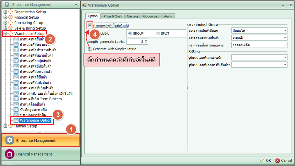 Enterprise Management >> Warehouse Setup >> Warehouse Option ติ๊กเลือกกำหนดคลังที่เก็บอัตโนมัติ