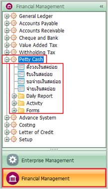 ผู้ใช้สามารถบัทึกเอกสารเงินสดย่อยได้โดยเข้าไปที่เมนู Financial Management >>Petty Cash