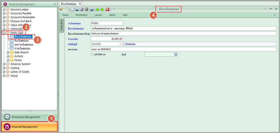 << Click to Display Table of Contents >> Navigation: TASCO ERP > Financial Management > Petty Cash > ตั้งวงเงินสดย่อย |