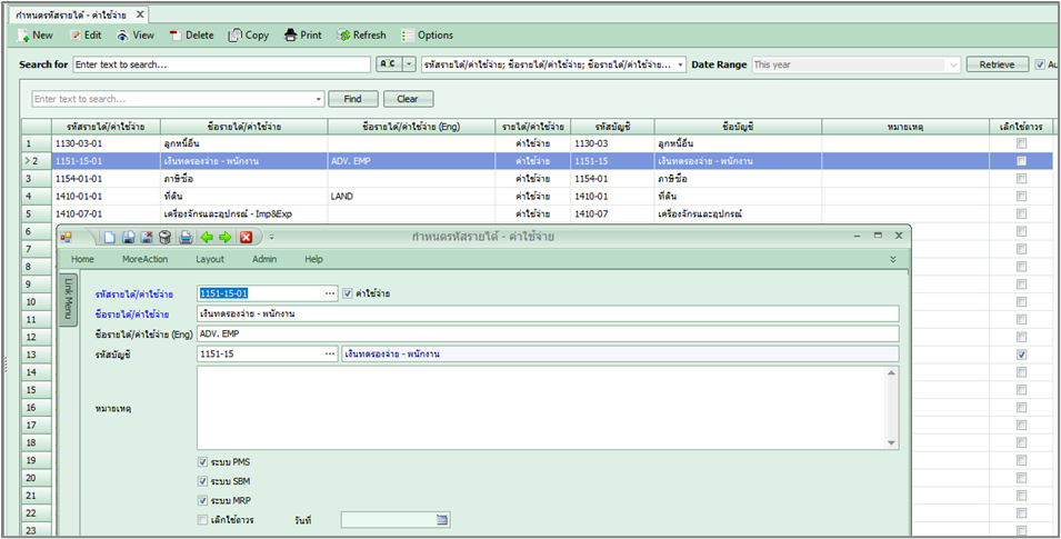 รหัสรายได้ – ค่าใช้จ่ายดังกล่าวจะนำไปใช้ที่ระบบใดบ้างก็จะเห็นรหัสค่าใช้จ่ายในระบบนั้น ๆ โดยรหัสจะนำไปใช้ได้ในระบบ PMS, SBM, MRP และ FMS |