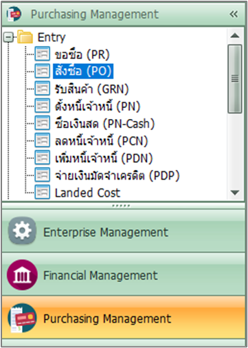 1.ผู้ใช้สามารถบันทึกเอกสารสั่งซื้อ โดยเข้าเมนู Purchasing Management >> Entry >> สั่งซื้อ (PO) ดังรูป