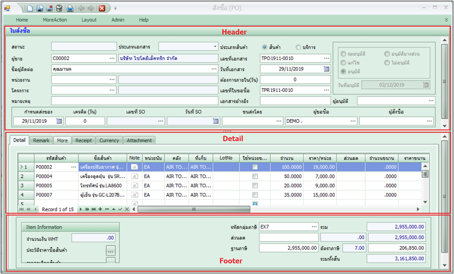 3.Header คือ การบันทึกรายละเอียดข้อมูลเอกสารสั่งซื้อ เช่น ประเภทเอกสาร เลขที่เอกสาร วันที่เอกสาร เป็นต้น ผู้ใช้ควรระบุข้อมูลต่างในหน้าบันทึกให้ครบถ้วน