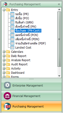 1.ผู้ใช้สามารถบันทึกเอกสารซื้อเงินสด โดยเข้าเมนู Purchase Management >> ซื้อเงินสดดังรูป