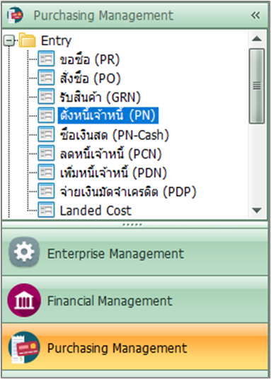 1.ผู้ใช้สามารถบันทึกเอกสารตั้งหนี้เจ้าหนี้ โดยเข้าเมนู Purchasing Management >> Entry >> ตั้งหนี้เจ้าหนี้ (PN) ดังรูป