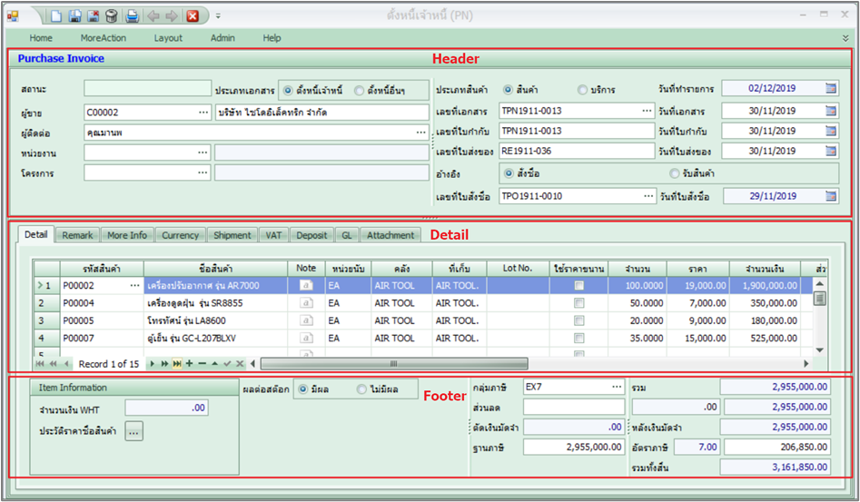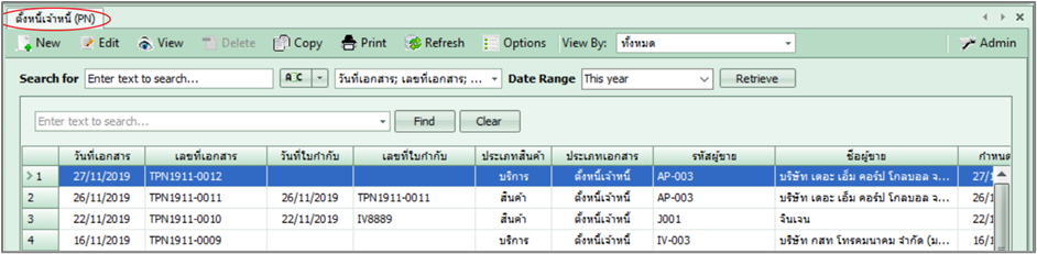 << Click to Display Table of Contents >> Navigation: TASCO ERP > Purchasing Management > Entry > ตั้งหนี้เจ้าหนี้ (PN) |