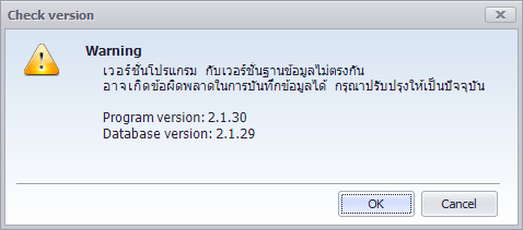 2. เวอร์ชั่นฐานข้อมูล สูงกว่าเวอร์ชั่นโปรแกรม กล่าวคือ โปรแกรมของผู้ใช้ยังไม่ได้อัพเดท เท่ากับเวอร์ชั่นฐานข้อมูล ต้องอัพเดทโปรแกรม