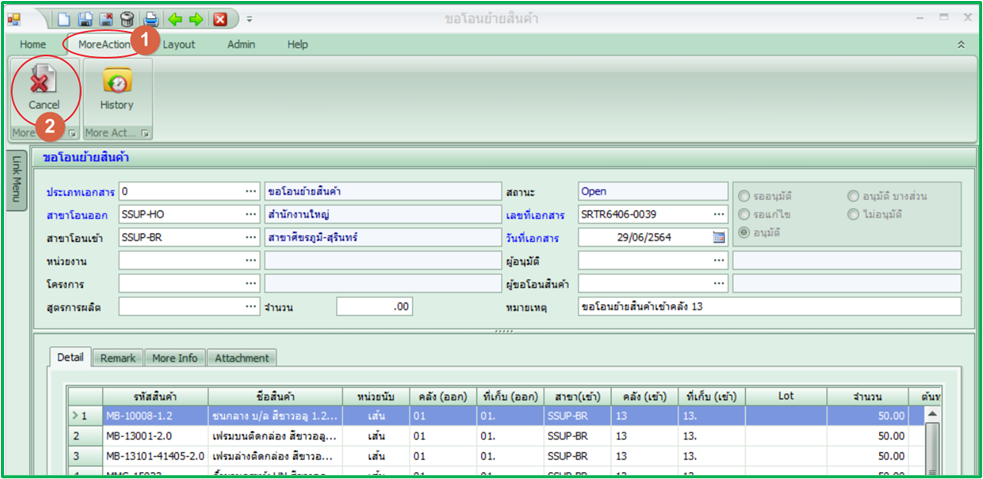 กรณีสถานะเอกสารเป็น Open ให้ทำการยกเลิกเอกสาร ตามขั้นตอนดังนี้