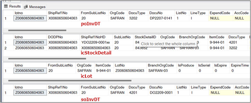 •ใบขาขนเข้า {poInvDT}: ItemCode {รหัสสินค้า}, LotNo {ล็อต}, ShipRef1No {เลขที่ใบขนขาเข้า}, FromSubListNo {ลำดับใบขน}