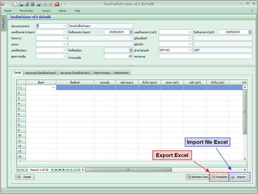 เพิ่มการทำงานหน้าจอ โอนสินค้า (ออก-เข้า) อัตโนมัติ ให้สามารถ Import ข้อมูลจาก Excel เพื่อช่วยในการคีย์ข้อมูล ตามตัวอย่าง ดังภาพ